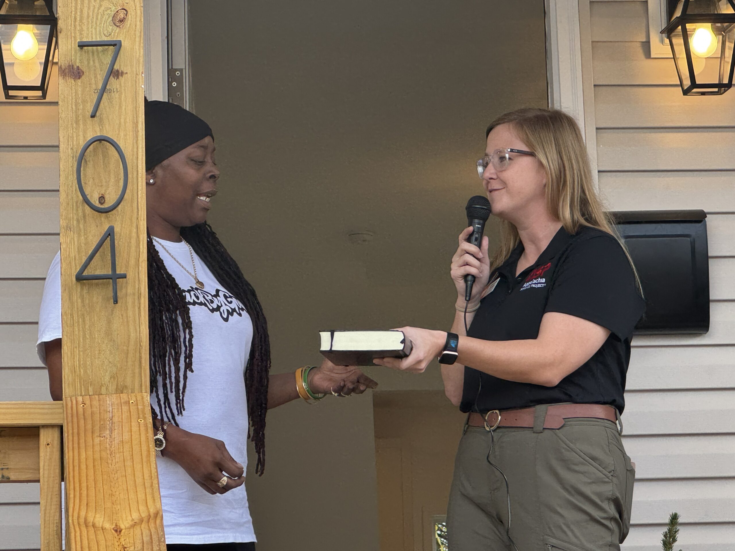 Annalee Posey, right, Assistant Director of Home Repair for Appalachia Service Project, presents new homeowner Deanna McKinney with keys and a Bible. McKinney’s home marked the first time ASP has gutted and renovated a home for a new owner.